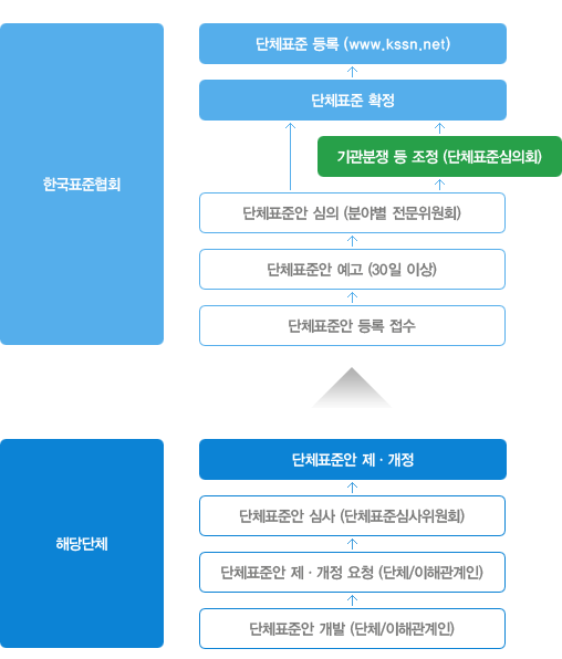 단체표준을 제정하고자 하는 단체는 ‘단체표준지원 및 촉진 운영 요령(기술표준원 고시 제2008-549호)’의 규정에 의거, 자체적으로 표준안을 작성하여 이해관계인의 동의 및 심의를 거친 후 단체표준활동 지원 추진 사무국(한국표준협회)에 등록을 하고, 3년마다 적부를 확인하여야 합니다. 단체표준 인증업무를 수행하고자 하는 단체는 사무국에 등록된 단체 표준을 활용하여 단체표준 인증업무를 수행할 수 있으며, 이를 위해서 국제기준(ISO/IEC Guide65)에 적합하도록 ‘단체표준 인증에 관한 업무규정’을 제정하고 이에 따라 실시하여야 합니다.